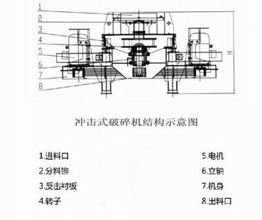 立式冲击式破碎机由进料、分料器、涡动破碎腔、叶轮体验、主轴总成、底座传动装置及电机等七部分组成。